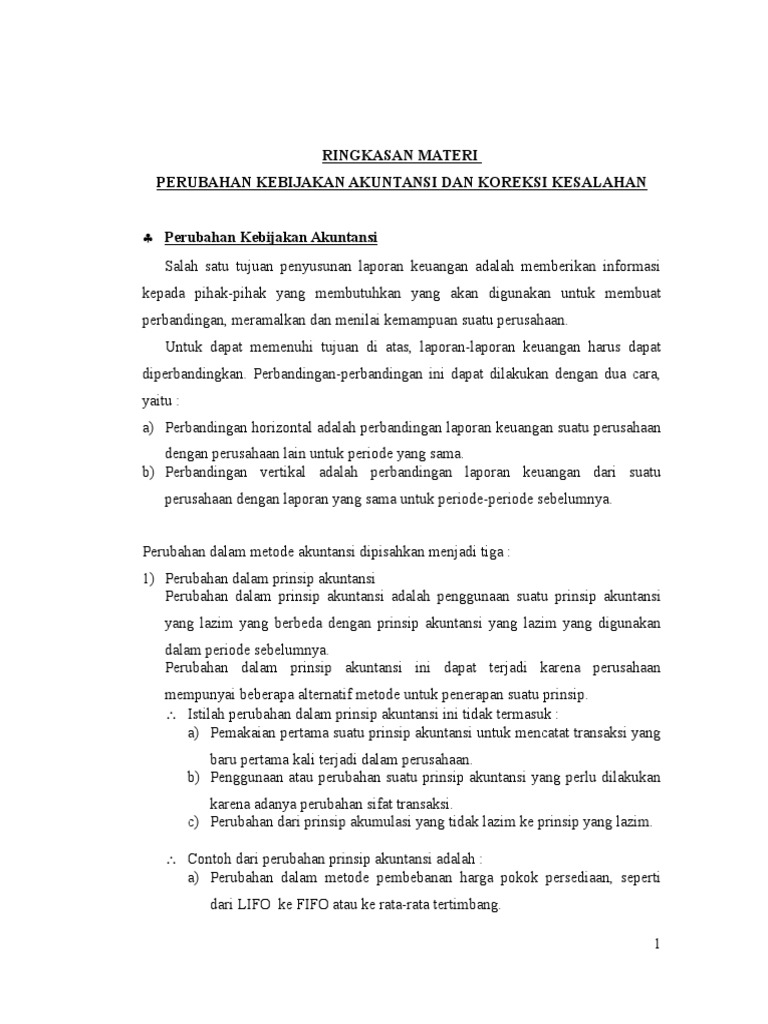 IKHTISAR PERUBAHAN AKUNTANSI DAN KOREKSI KESALAHAN. Sampai saat ini pembahasan tentang analisis kesalahan lebih ditujukan pada identifikasi jenis kesalahan yang terlibat dan akuntansi untuk mengoreksinya dalam catatan akuntansi. Perubahan dalam metode pembebanan harga pokok persediaan seperti dari LIFO ke FIFO atau ke rata-rata tertimbang. Kebijakan akuntansi adalah sebuah aturan yang telah ditetapkan oleh pihak tertentu yang berisikan informasi mengenai prinsip dasar dalam penyusun dan menyajikan laporan. Pegertian perubahan metoda akun.